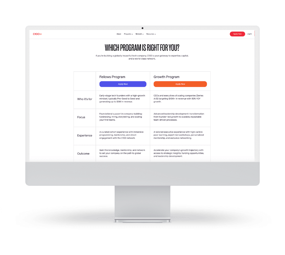 As part of the website revamp, I redesigned the application experience to improve usability and conversions. I created a clear program overview page that helped users quickly understand the differences between C100’s programs and decide which one was right for them. Strategic CTAs were placed throughout the page to guide and nudge users toward the application, resulting in a more intuitive flow and increased application submissions.
