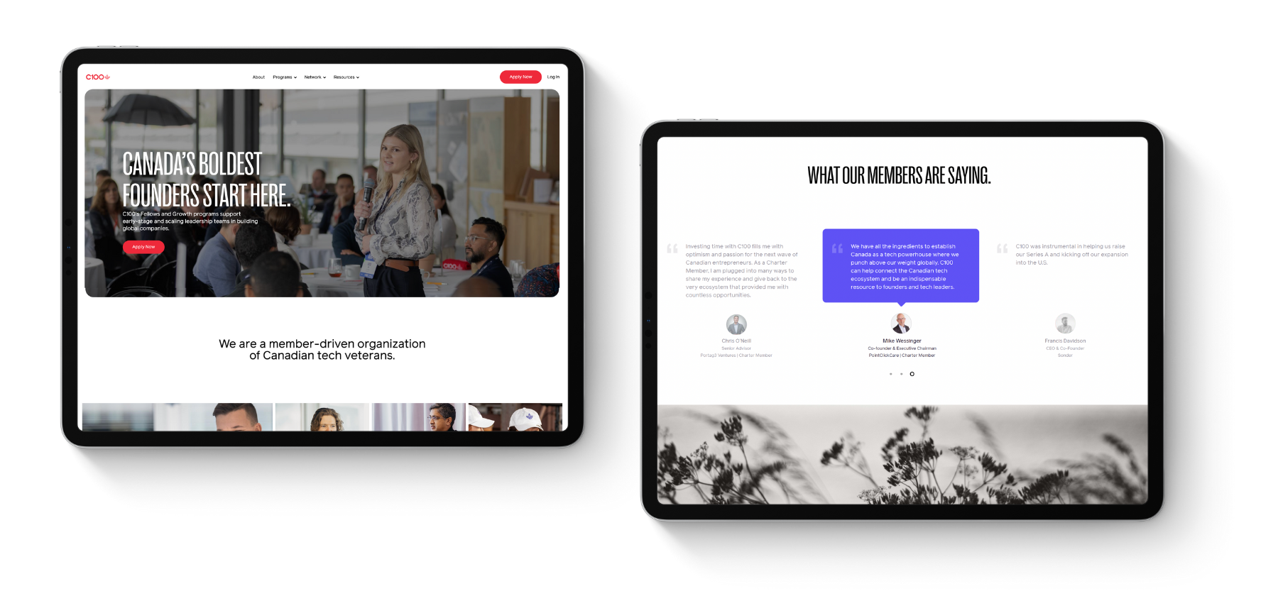 C100, an organization dedicated to supporting Canadian tech founders, needed a website that reflected the caliber of their network and spoke directly to the entrepreneurial community they serve. Their previous site was outdated, hard to navigate and difficult to update. They wanted a modern site they could manage with ease.